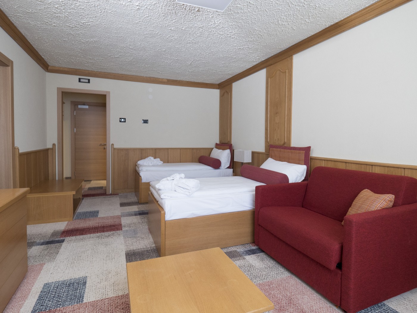 FAMILY - čtyřlůžkové až pětilůžkové pokoje o rozloze 28 - 36 m2, dvoulůžkové ložnice jsou od sebe oddělené dveřmi, dvojí soc. zařízení, s kobercem, ve druhé hotelové budově, jen s okny, nebo s balkonem
