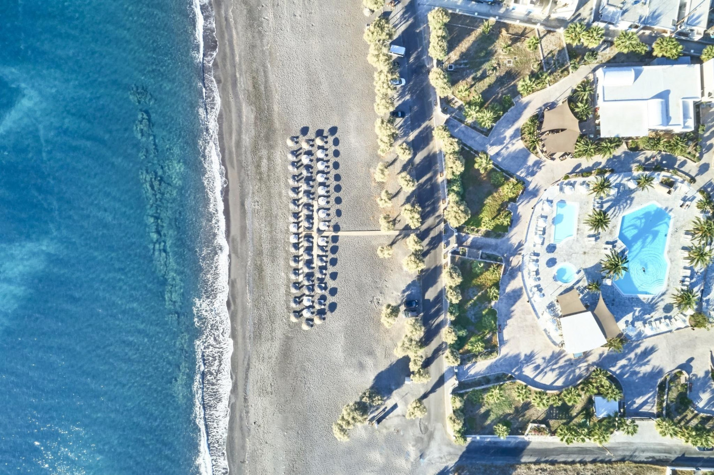 Jedinečné pláže: Pobřeží je rozmanité – od dlouhých pláží s černým sopečným pískem (Kamari, Perissa) po ikonickou Červenou pláž (Red Beach).